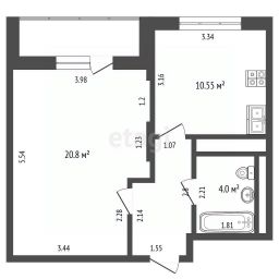 - просторная комната 20.8 м2 с лоджией, кухня 10.55 м2, совмещенный санузел 4 м2.