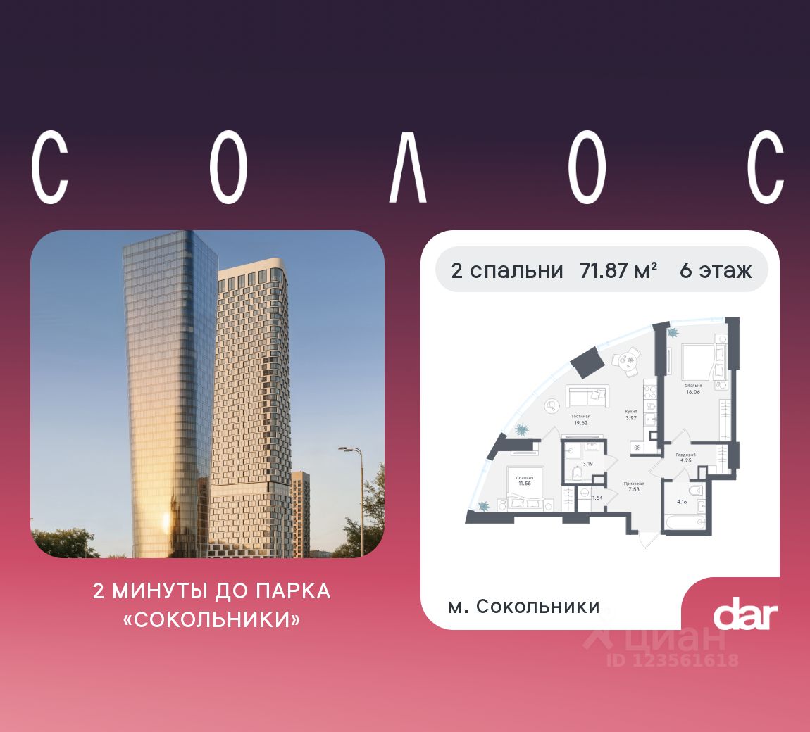 Продаётся 2-комнатная квартира 71.87 м² в жилом комплексе Солос (бизнес-класс) рядом с парком Сокольники. Квартиру отличают панорамное остекление, потолки 3.2 м, улучшенная шумо и воздухоизоляция. Дом сдаётся в 4 квартале 2029 года, продажи проходят через эскроусчета. Подземный паркинг, коворкинг, закрытая благоустроенная территория с фонтаном и артобъектами. Гибкие условия покупки.