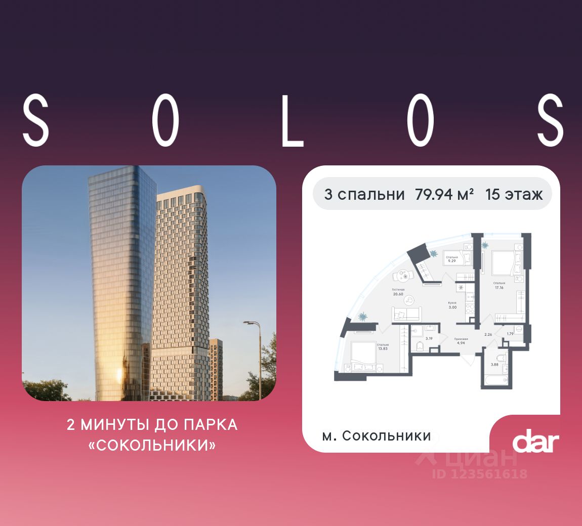 Продаётся 3-комнатная квартира 79.94 м² в жилом комплексе SOLOS (бизнес-класс) рядом с парком Сокольники. Квартиру отличают панорамное остекление, потолки 3.2 м, улучшенная шумо и воздухоизоляция. Дом сдаётся в 4 квартале 2029 года, продажи проходят через эскроусчета. Подземный паркинг, коворкинг, закрытая благоустроенная территория с фонтаном и артобъектами. Гибкие условия покупки.