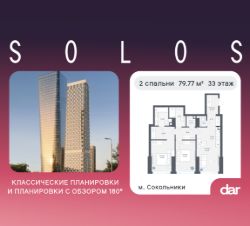 Продаётся 2-комнатная квартира 79.77 м² в жилом комплексе SOLOS (бизнес-класс) рядом с парком Сокольники. Квартиру отличают панорамное остекление, потолки 3.2 м, улучшенная шумо и воздухоизоляция. Дом сдаётся в 4 квартале 2029 года, продажи проходят через эскроусчета. Подземный паркинг, коворкинг, закрытая благоустроенная территория с фонтаном и артобъектами. Гибкие условия покупки.