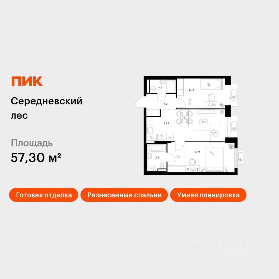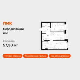 Продаётся 2-комн. квартира площадью 57,3 кв.м на 10 этаже 16 этажного дома (Корпус 2.1.6, Секция 6) проекта ПИК Середневский лес. Светлый просторный подъезд на уровне земли, функциональная планировка, большие окна, c отделкой.