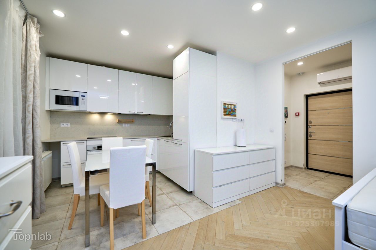 Кухня полностью укомплектована встроенной техникой Bosch, холодильником. В квартире установлен кондиционер. Теплые полы в ванной комнате.