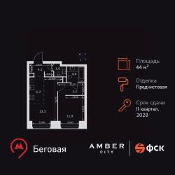 Продаётся 2-к квартира номер 654 общей площадью 44.2 кв.м. на 3-м этаже 57 этажного здания. Отделка Whitebox. Цена с учётом скидки.