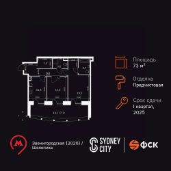 Продаётся 2-к квартира номер 366 общей площадью 73.2 кв.м. на 15-м этаже 44 этажного здания. Отделка Whitebox. Цена с учётом скидки.