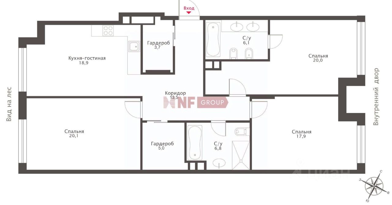Планировка свободная, оптимальный вариант организации пространства: гостиная с зоной кухни и выходом на лоджию, две спальни с собственными ванными, дополнительная спальня или кабинет, гостевой санузел, гардеробная.