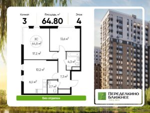 Общая площадь квартиры - 64,8 кв. м, этаж 4 из 17.