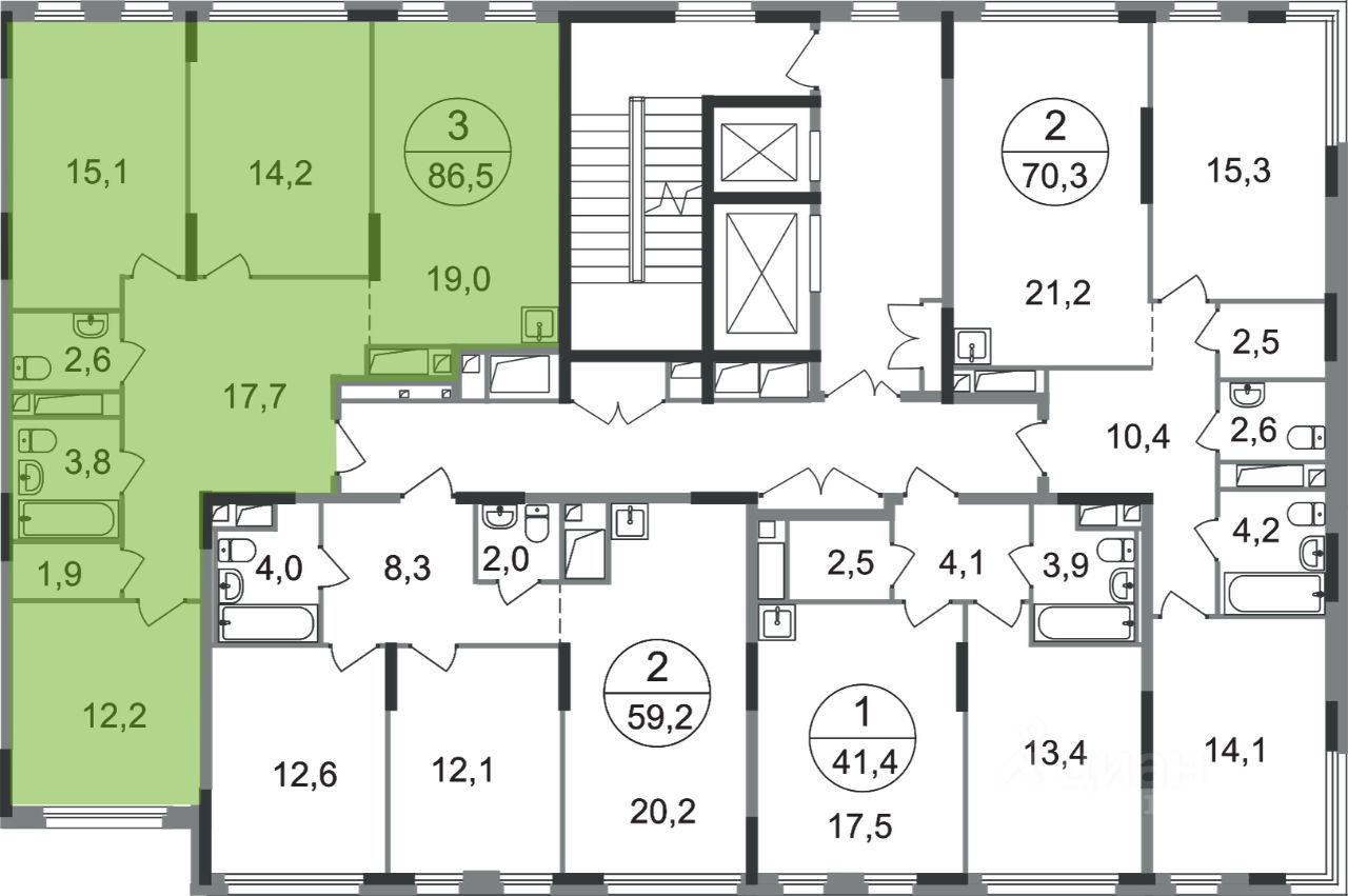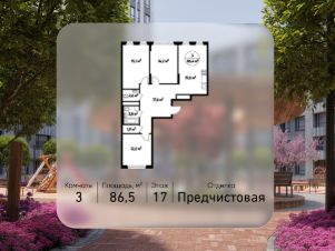 Общая площадь квартиры - 86,5 кв. м, этаж 17 из 17.