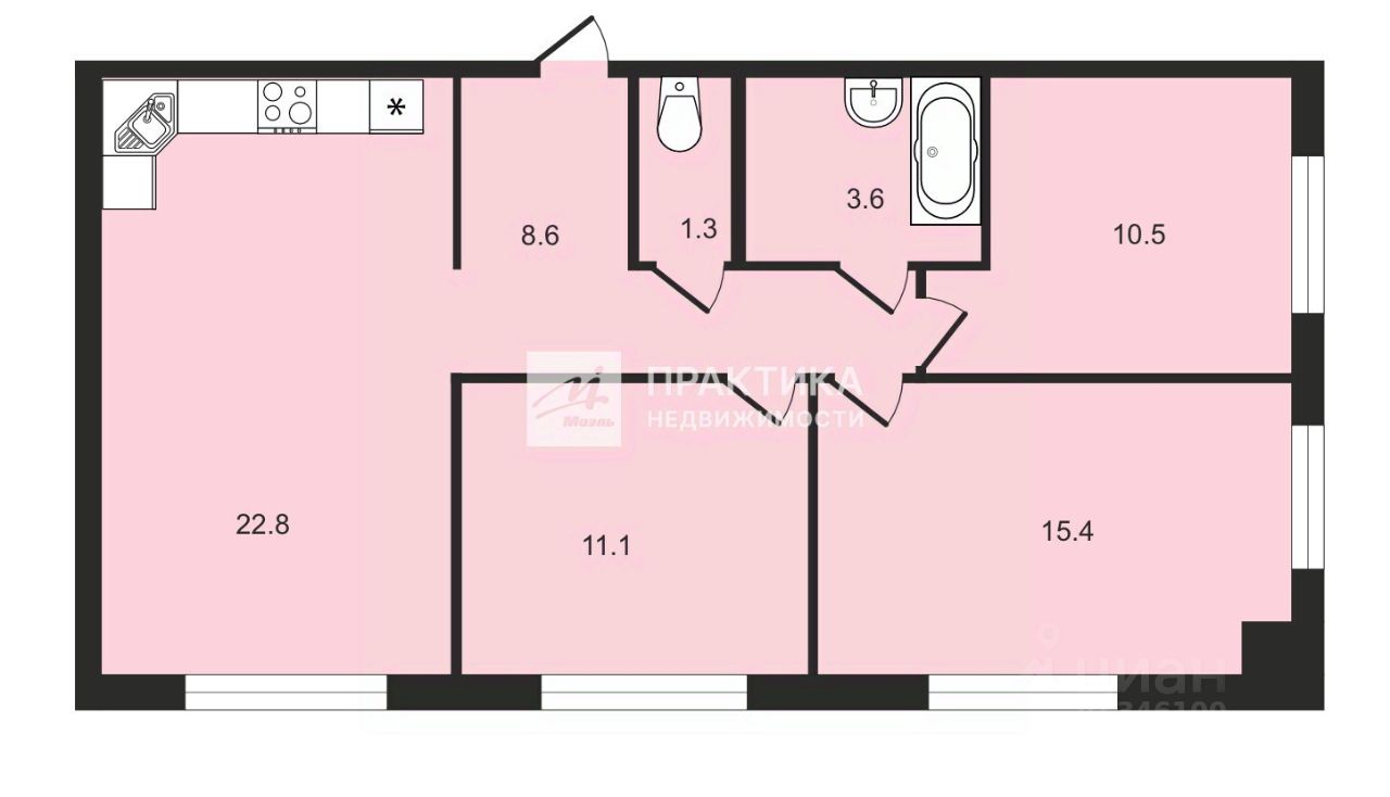 просторная кухня-гостиная - 22,8 кв.мтри изолированные комнаты - 11,1 кв.м, 15,4 кв.м, 10,5 кв.мпросторный холлдва полностью укомплектованных санузла