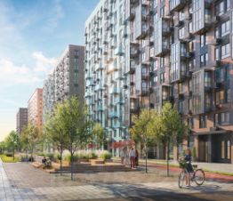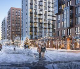 В квартале — монолитные дома комфортной высоты, от 10 этажей. Светлые фасады украшают кирпичные вставки в теплых природных оттенках.