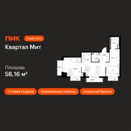 Новостройка! Продается 2-комн. кв-ра площадью 58,16 кв.м, (Корпус 3.4, Секция 4) 4 этаж 32-этажного дома в Квартал Мит от ПИК. "Квартал Мит" строится в экологически чистом районе Митино, где по соседству расположен большой лесопарк, а с двух сторон протекают реки Сходня и Журавка. Для семей с детьми здесь появится школа и два детских сада.