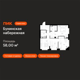 Продаётся 2-комн. квартира площадью 58 кв.м на 11 этаже 16 этажного дома (Корпус 2.6/1.1, Секция 1) проекта ПИК Бунинская набережная. Светлый просторный подъезд на уровне земли, функциональная планировка, большие окна, c отделкой.