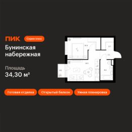 Продаётся 1-комн. квартира площадью 34,3 кв.м на 12 этаже 16 этажного дома (Корпус 2.6/1.1, Секция 1) проекта ПИК Бунинская набережная. Светлый просторный подъезд на уровне земли, функциональная планировка, большие окна, c отделкой.