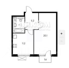 Квартира общей площадью 40.7 кв.м, расположена на 3 этаже. Функциональная планировка: просторная кухня-гостиная 11 кв.м, комната 20.1 кв.м с балконом, совмещенный санузел.