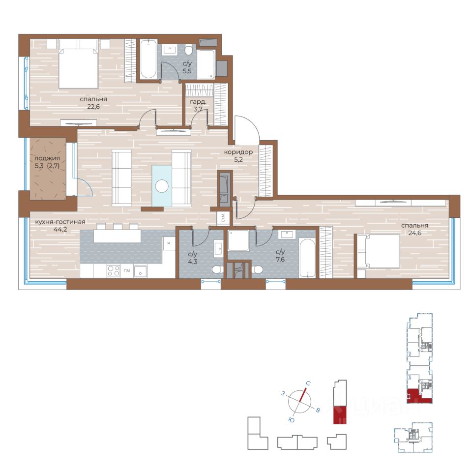 Продается 3-комн. в ЖК "ОСТРОВ" на 6-м этаже. Общая площадь лота составляет 122.40 кв. м. В каждом подъезде запроектирован пассажирский и грузовой лифты.