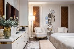 В гостиной установлен камин на биотопливе, не требующий дымохода, и организована стильная барная зона. Панорамное остекление и французские балконы наполняют пространство светом и открывают впечатляющие виды, а выход на террасу добавляет объекту уникальности.