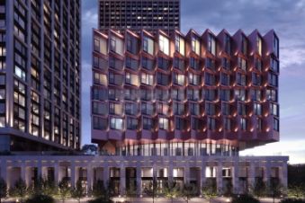 Полностью стеклянные короны с ламелями на верхних этажах.