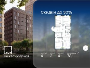 В активно развивающемся районе на юго-востоке столицы продается 4-комнатная квартира площадью 78,1 кв.м без отделки.. Квартира расположена на 3 этаже 9-этажного этажного корпуса 4 в жилом комплексе комфорт-класса Level Нижегородская (компания Level Group/Левел групп).