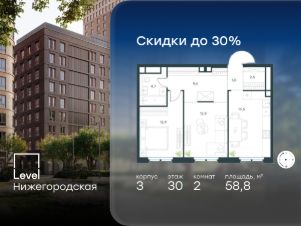 В активно развивающемся районе на юго-востоке столицы продается 2-комнатная квартира площадью 58,8 кв.м без отделки.. Квартира расположена на 30 этаже 37-этажного этажного корпуса 3 в жилом комплексе комфорт-класса Level Нижегородская (компания Level Group/Левел групп).