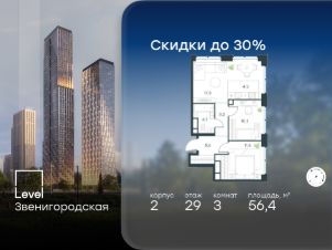В жилом квартале продаётся 3-комнатная квартира площадью 56.40 кв.м без отделки. Квартира расположена на 29 этаже 64 этажного корпуса 2 в жилом комплексе комфорт класса Level Звенигородская (компания Level Group/Левел групп).