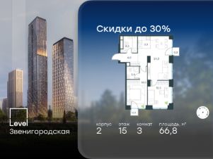 В жилом квартале продаётся 3-комнатная квартира площадью 66.80 кв.м без отделки. Квартира расположена на 15 этаже 64 этажного корпуса 2 в жилом комплексе комфорт класса Level Звенигородская (компания Level Group/Левел групп).