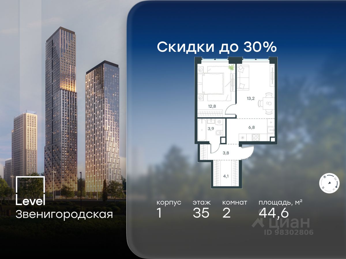 В жилом квартале продаётся 2-комнатная квартира площадью 44.60 кв.м white box. Квартира расположена на 35 этаже 48 этажного корпуса 1 в жилом комплексе комфорт класса Level Звенигородская (компания Level Group/Левел групп).
