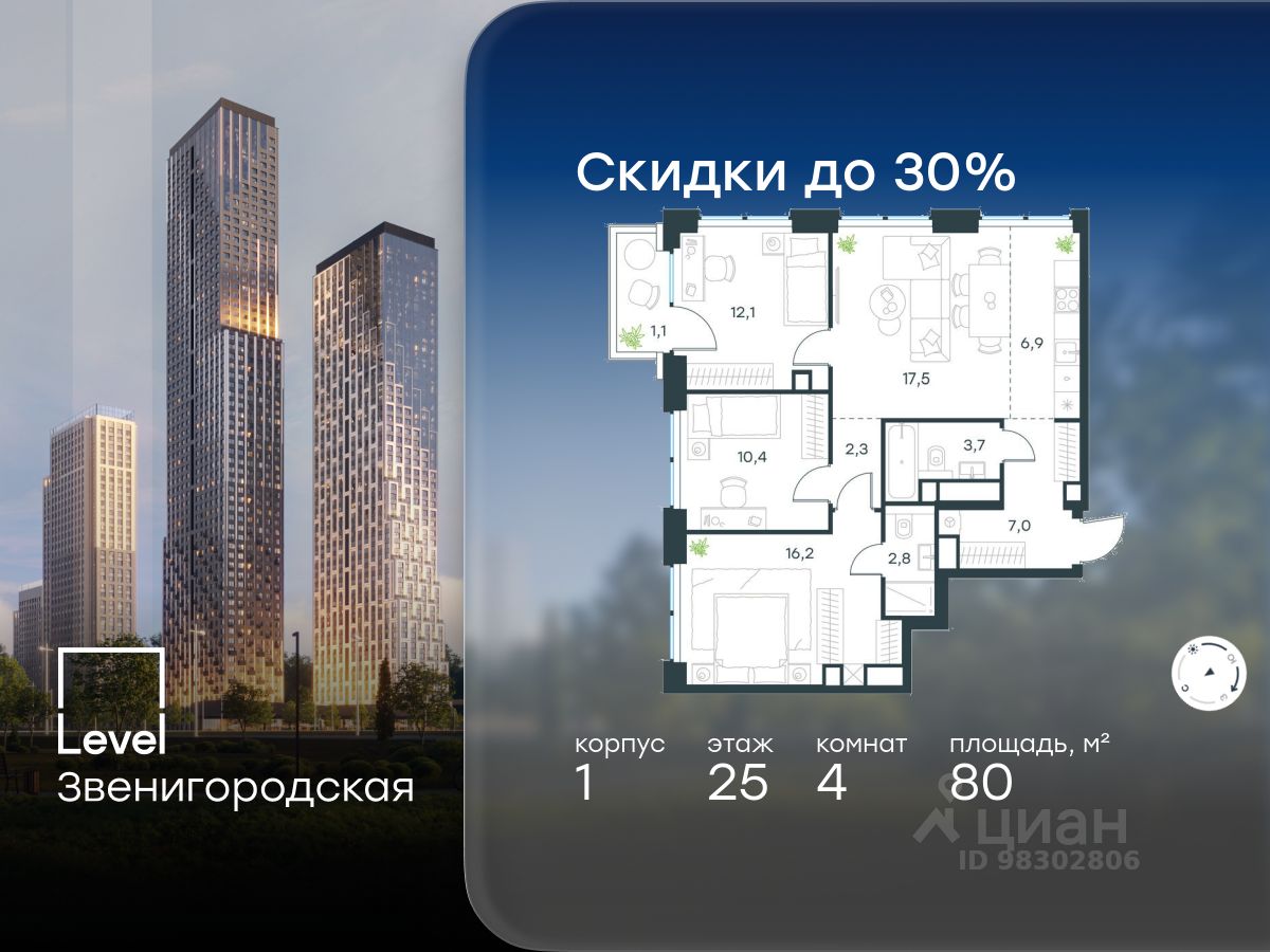 В жилом квартале продаётся 4-комнатная квартира площадью 80.00 кв.м white box. Квартира расположена на 25 этаже 48 этажного корпуса 1 в жилом комплексе комфорт класса Level Звенигородская (компания Level Group/Левел групп).