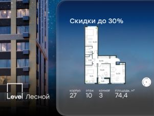В районе, утопающем в густой зелени лесов, многочисленных парков и скверов, продаётся 3-комнатная квартира площадью 74.40 кв.м с отделкой white box. Квартира расположена на 10 этаже в жилом комплексе комфорт-класса Level Лесной (компания Level Group/Левел групп).