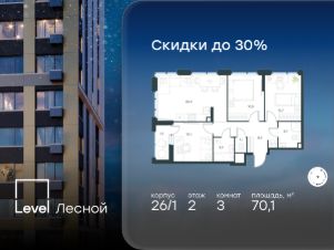 В районе, утопающем в густой зелени лесов, многочисленных парков и скверов, продаётся 3-комнатная квартира площадью 70.10 кв.м с отделкой white box. Квартира расположена на 2 этаже в жилом комплексе комфорт-класса Level Лесной (компания Level Group/Левел групп).