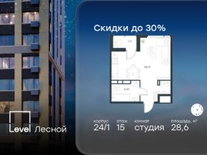 В районе, утопающем в густой зелени лесов, многочисленных парков и скверов, продаётся студия площадью 28.60 кв.м без отделки. Квартира расположена на 15 этаже в жилом комплексе комфорт-класса Level Лесной (компания Level Group/Левел групп).