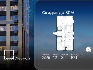 В районе, утопающем в густой зелени лесов, многочисленных парков и скверов, продаётся 3-комнатная квартира площадью 87.10 кв.м с отделкой white box. Квартира расположена на 12 этаже в жилом комплексе комфорт-класса Level Лесной (компания Level Group/Левел групп).