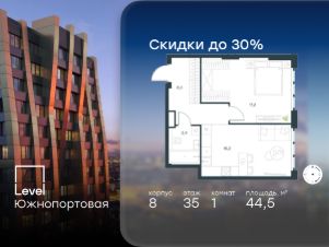 В северной части района Печатники продается 1-комнатная квартира площадью 44.50 кв.м без отделки. Квартира расположена на 35 этаже 49-этажного корпуса 8 в жилом комплексе комфорт-класса Level Южнопортовая (компания Level Group/Левел групп).
