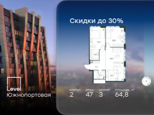 В северной части района Печатники продается 3-комнатная квартира площадью 64.80 кв.м без отделки. Квартира расположена на 47 этаже 47-этажного корпуса 2 в жилом комплексе комфорт-класса Level Южнопортовая (компания Level Group/Левел групп).