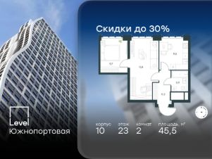 В северной части района Печатники продается 2-комнатная квартира площадью 45.50 кв.м без отделки. Квартира расположена на 23 этаже 68-этажного корпуса 10 в жилом комплексе комфорт-класса Level Южнопортовая (компания Level Group/Левел групп).