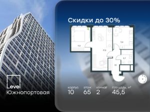 В северной части района Печатники продается 2-комнатная квартира площадью 45.50 кв.м без отделки. Квартира расположена на 65 этаже 68-этажного корпуса 10 в жилом комплексе комфорт-класса Level Южнопортовая (компания Level Group/Левел групп).