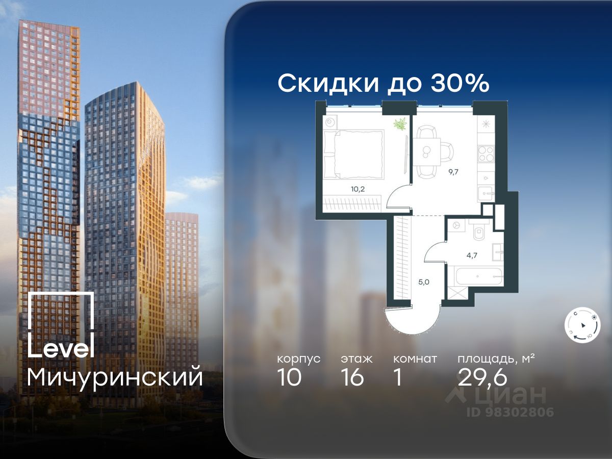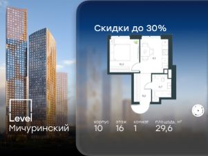 В жилом квартале, расположенном на границе с природным заказником "Долина реки Очаковки", продаётся 1-комнатная квартира площадью 29.60 кв.м с отделкой white box. Квартира расположена на 16 этаже 42-этажного корпуса 10 в жилом комплексе бизнес-класса Level Мичуринский (компания Level Group/Левел групп).