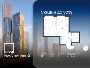 В жилом квартале, расположенном на границе с природным заказником "Долина реки Очаковки", продаётся 1-комнатная квартира площадью 33.70 кв.м с отделкой white box. Квартира расположена на 28 этаже 42-этажного корпуса 10 в жилом комплексе бизнес-класса Level Мичуринский (компания Level Group/Левел групп).