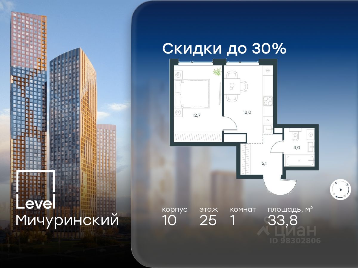В жилом квартале, расположенном на границе с природным заказником "Долина реки Очаковки", продаётся 1-комнатная квартира площадью 33.80 кв.м с отделкой white box. Квартира расположена на 25 этаже 42-этажного корпуса 10 в жилом комплексе бизнес-класса Level Мичуринский (компания Level Group/Левел групп).