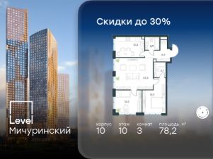 В жилом квартале, расположенном на границе с природным заказником "Долина реки Очаковки", продаётся 3-комнатная квартира площадью 78.20 кв.м с отделкой white box. Квартира расположена на 10 этаже 42-этажного корпуса 10 в жилом комплексе бизнес-класса Level Мичуринский (компания Level Group/Левел групп).