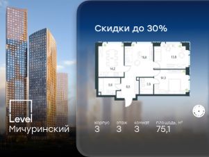 В жилом квартале, расположенном на границе с природным заказником "Долина реки Очаковки", продаётся 3-комнатная квартира площадью 75.10 кв.м с отделкой white box. Квартира расположена на 3 этаже 30-этажного корпуса 3 в жилом комплексе бизнес-класса Level Мичуринский (компания Level Group/Левел групп).