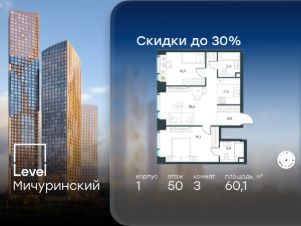 В жилом квартале, расположенном на границе с природным заказником "Долина реки Очаковки", продаётся 3-комнатная квартира площадью 60.10 кв.м без отделки. Квартира расположена на 50 этаже 54-этажного корпуса 1 в жилом комплексе бизнес-класса Level Мичуринский (компания Level Group/Левел групп).