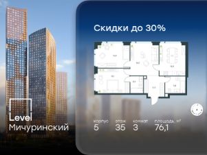 В жилом квартале, расположенном на границе с природным заказником "Долина реки Очаковки", продаётся 3-комнатная квартира площадью 76.10 кв.м с отделкой white box. Квартира расположена на 35 этаже 37-этажного корпуса 5 в жилом комплексе бизнес-класса Level Мичуринский (компания Level Group/Левел групп).