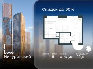 В жилом квартале, расположенном на границе с природным заказником "Долина реки Очаковки", продаётся студия площадью 22.60 кв.м с отделкой white box. Квартира расположена на 5 этаже 24-этажного корпуса 11 в жилом комплексе бизнес-класса Level Мичуринский (компания Level Group/Левел групп).