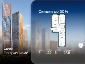 В жилом квартале, расположенном на границе с природным заказником "Долина реки Очаковки", продаётся 3-комнатная квартира площадью 67.50 кв.м без отделки. Квартира расположена на 22 этаже 24-этажного корпуса 7 в жилом комплексе бизнес-класса Level Мичуринский (компания Level Group/Левел групп).