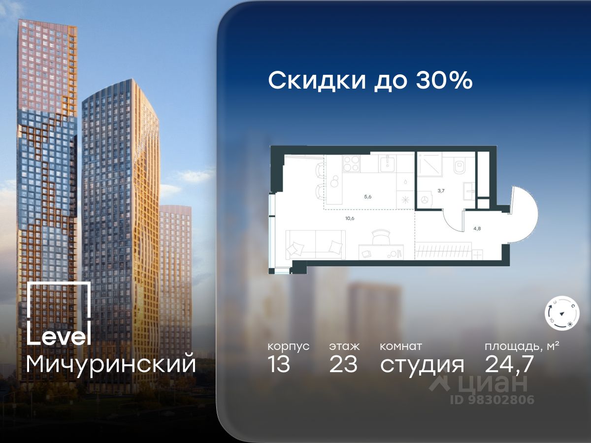 В жилом квартале, расположенном на границе с природным заказником "Долина реки Очаковки", продаётся студия площадью 24.70 кв.м без отделки. Квартира расположена на 23 этаже 31-этажного корпуса 13 в жилом комплексе бизнес-класса Level Мичуринский (компания Level Group/Левел групп).