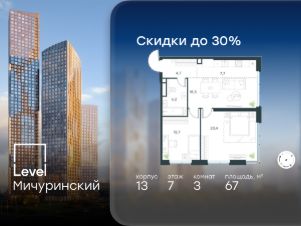 В жилом квартале, расположенном на границе с природным заказником "Долина реки Очаковки", продаётся 3-комнатная квартира площадью 67.00 кв.м без отделки. Квартира расположена на 7 этаже 31-этажного корпуса 13 в жилом комплексе бизнес-класса Level Мичуринский (компания Level Group/Левел групп).