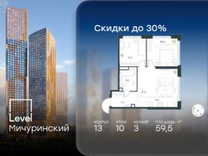 В жилом квартале, расположенном на границе с природным заказником "Долина реки Очаковки", продаётся 3-комнатная квартира площадью 59.50 кв.м без отделки. Квартира расположена на 10 этаже 31-этажного корпуса 13 в жилом комплексе бизнес-класса Level Мичуринский (компания Level Group/Левел групп).