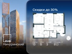 В жилом квартале, расположенном на границе с природным заказником "Долина реки Очаковки", продаётся 3-комнатная квартира площадью 81.10 кв.м без отделки. Квартира расположена на 5 этаже 31-этажного корпуса 13 в жилом комплексе бизнес-класса Level Мичуринский (компания Level Group/Левел групп).
