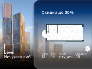 В жилом квартале, расположенном на границе с природным заказником "Долина реки Очаковки", продаётся студия площадью 28.00 кв.м без отделки. Квартира расположена на 14 этаже 31-этажного корпуса 13 в жилом комплексе бизнес-класса Level Мичуринский (компания Level Group/Левел групп).