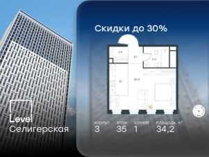 В жилом квартале, расположенном в южной части района Западное Дегунино, продаётся 1-комнатная квартира площадью 34.20 кв.м без отделки. Квартира расположена на 35 этаже 40-этажного корпуса 3 в жилом комплексе комфорт-класса Level Селигерская (компания Level Group/Левел групп).