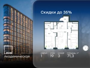 В Академическом районе продаётся 3-комнатная квартира площадью 71.30 кв.м без отделки. Квартира расположена на 19-м этаже 19-этажного жилого комплекса бизнес-класса Level Академическая (компания Level Group).